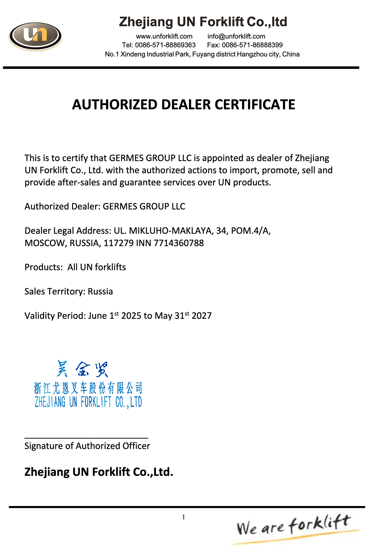 А с февраля 2024 года наша компания пополнила портфель продаваемых брендов полным спектром техники производства ZHEJIANG UN FORKLIFT CO.,LTD, что так же подтверждается сертификатом дистрибьютора.